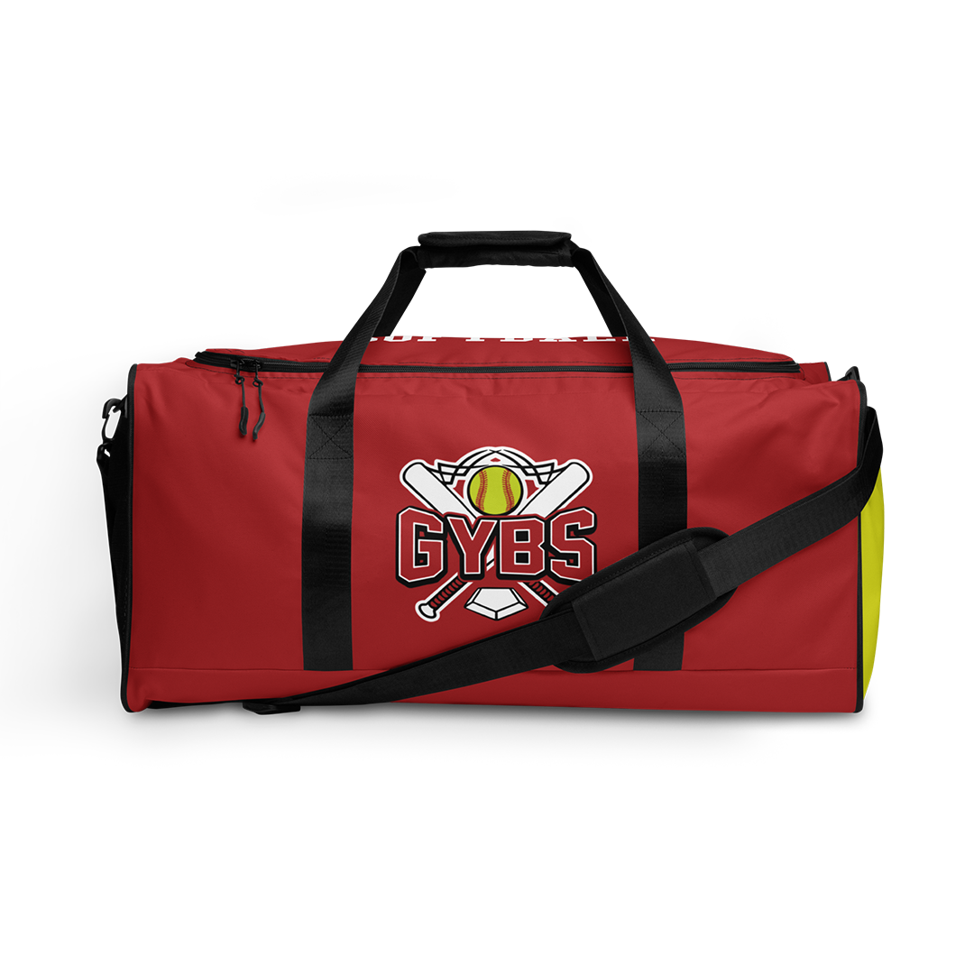 The Gustine Softball Duffle — bold Gustine Red with Gustine Yellow side panels, roomy main compartment and dual zippered side pockets for shoes and gear. Finished with clean Gustine Softball branding for game-day style and easy organization.